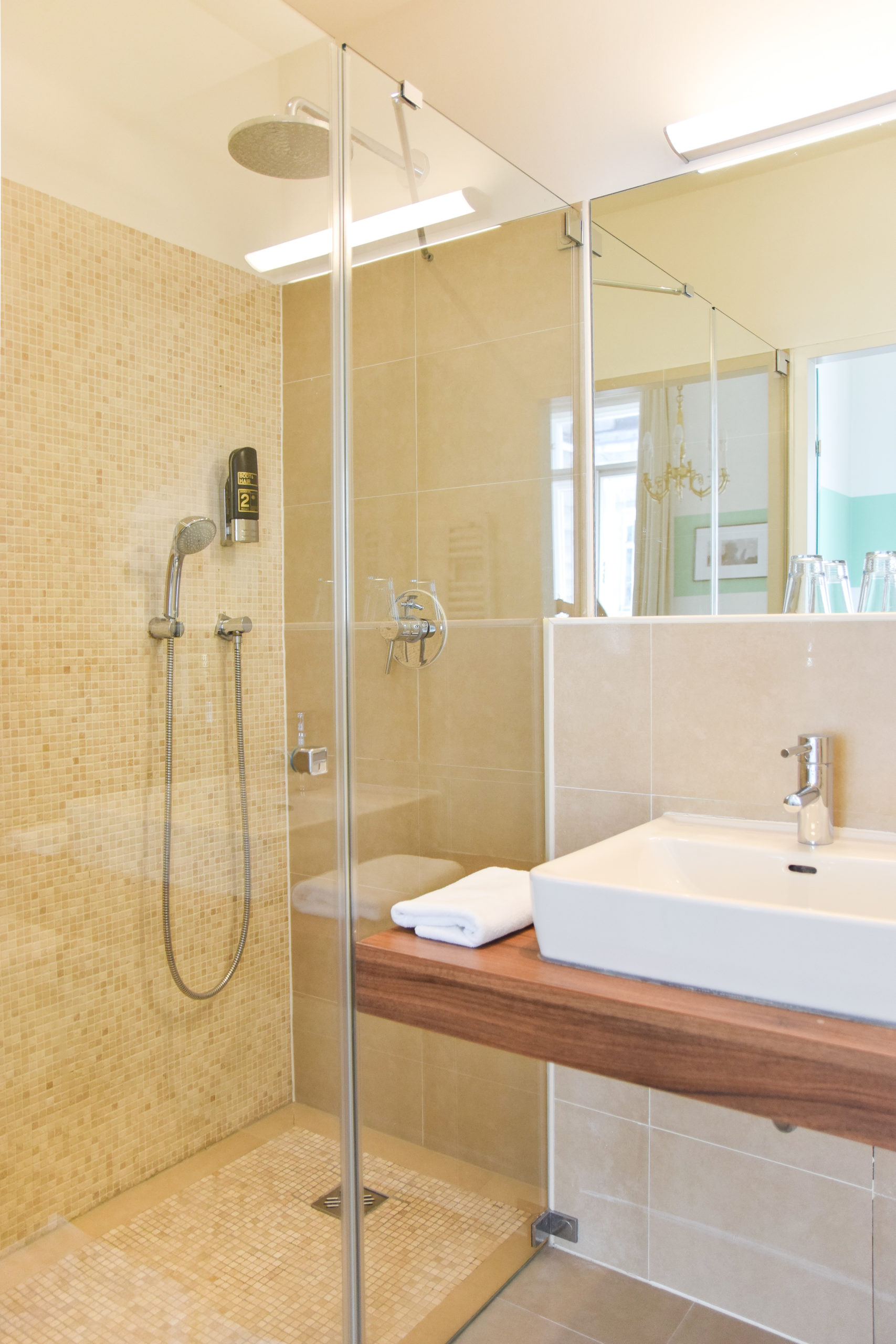 XL-Glasduschkabine, Regenbrause, Handtuch-Heizkörper, Haarfön, XL-Spiegel
